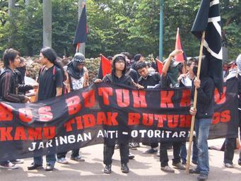 | Keywords: Protest march in Jakarta, Indonesia - 20070501.jpg A group of young men forming a w black bloc marching during a demonstration in Jakarta Indonesia holding flags and a banner The words on the banner which are partly hidden are BOS BUTUH KAMU / KAMU TIDAK BUTUH BOS / JARINGAN ANTI-OTORITARIAN which means The boss needs you / You do not need the boss / Anti-authoritarian network The black flag with an A in a circle in white on it held by a protester in front of the banner is a well-known anarchist symbolism Circle-A anarchist symbol Own 2007-05-01 11 03 HarisX 1st of May in Indonesia Photographs of anarchist flags Black bloc Circle-A symbols Files by HarisX Jakarta Protest marches in Indonesia Banners and signs at demonstrations and protests relating to May Day |