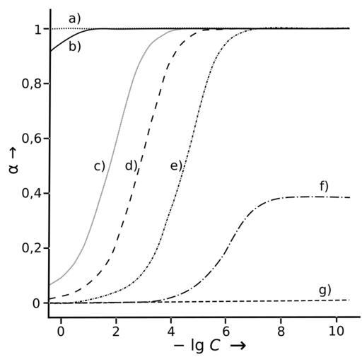 | Keywords: Protolysegrad-Konzentration.svg Protolysegrad verschiedener Säuren in Abhängigkeit von ihrer Konzentration a HCl b HNO3 c HClO2 d HF e HOAc f HClO g HCN Werte aus Klaus Bliefert pH-Wert-Berechnungen Weinheim 1978 own made 1 12 2010 Roland chem <span class signature-talk >talk</span> 11 20 1 September 2010 UTC PD-shape Acid-base reactions |