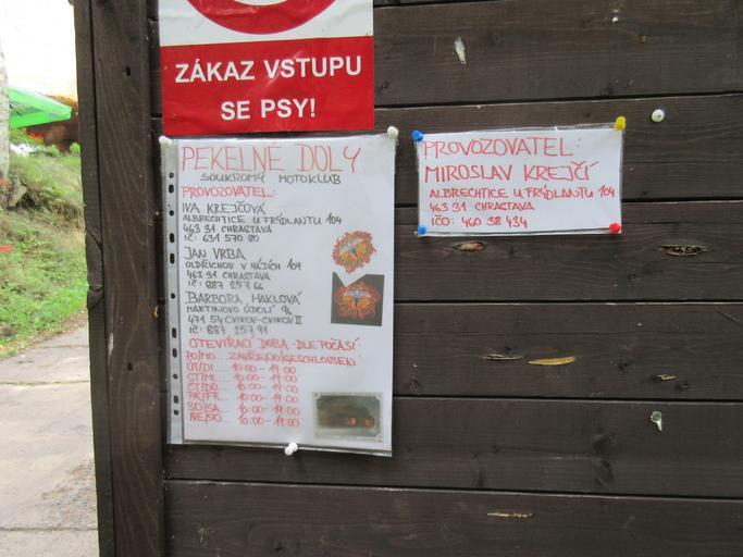 Keywords: Provozovatelé Pekelných dolů.JPG cs Cedulky na vstupu k jeskyním own Zákupák 2015-09-13 Pekelné doly Taken with Canon Digital IXUS 265 HS
