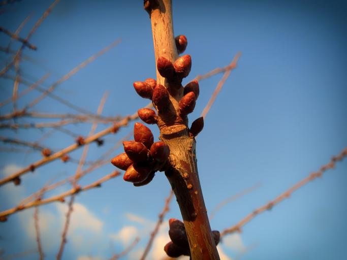 Keywords: prunus spinosa plant bulb new growth sky clouds nature outside twig branch macro close-up