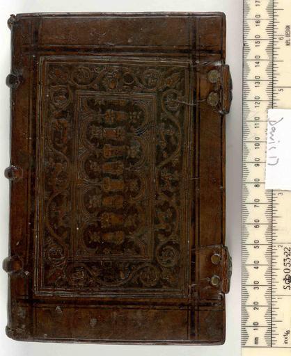 | Keywords: Psalterium Davidicum paraphrasibus - Upper cover (Davis17).jpg Style Panel design; Caption Upper cover; Colour Brown; Edge Unspecified exhibition history Decorative Technique Tooled in blind Panel stamp in blind; Cover Material Calf Wooden boards Traces of 2 pairs of clasps object history Text 1536; Cologne; Unspecified object type Cc-zero place of creation Binding England place of discovery See M M Foot The Henry Davis Gift vol II London 1983 British Library image http //www bl uk/catalogues/bookbindings/LargeImage aspx RecordId 020-000003152 ImageId ImageId 41181 Copyright BL Psalterium Davidicum paraphrasibus Uploaded with GWToolset Psalterium Davidicum paraphrasibus - Upper cover Davis17 http //www webarchive org uk/bldatasets/bindings/5679_4 jpg Bookbinding 16th-century bookbinding British Library Bookbindings |