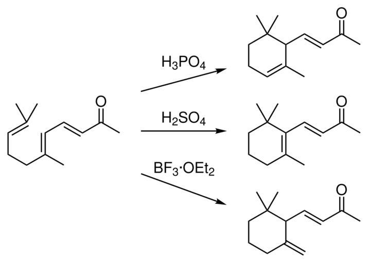 Keywords: Pseudoionone acid cyclization.svg Preparation of ionones by acid catalyzed cyclization of pseudoionone Own 2007-10-16 Calvero Orgenic syntheses Uncategorized 2015 March 20