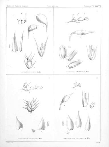 Keywords: PTRS168 0679.png A Bartramia pungens <small>Mitt </small> Philonotis pungens <small> Mitt Mitt </small> habitus cauline leaflets part of perichaetium mature spore capsule empty spore capsule antheridium B Callicostella læviuscula <small>Mitt </small> Callicostella laeviuscula <small>Mitt </small> habitus cauline leaflet of medial upper row cauline leaflet of mediolateral upper row cauline leaflet of lateral row perichaetium spore capsule with calyptra C Pterogonium curvifolium <small>Mitt </small> Trachyphyllum inflexum <small> Harv A Gepp</small> habitus cauloid section with leaflets cauline leaflet cauline leaflet D Sematophyllum fulvifolium <small>Mitt </small> habitus cauline leaflets perichaetium and antheridium spore capsule with operculum Philosophical Transactions of the Royal Society 168 An Account of the Petrological Botanical and Zoological Collections Made in Kerguelen's Land and Rodriguez During the Transit of Venus Expedition Carried Out by Order of Her Majesty's Government in the Years 1871-1875 Plate XXXVII 1879 Scan by the Internet Archive Author died more than 70 years ago - public domain PD-old Philosophical Transactions - Volume 168 Bryophyta botanical illustrations Philonotis pungens Callicostella laeviuscula Trachyphyllum inflexum Sematophyllum fulvifolium |
