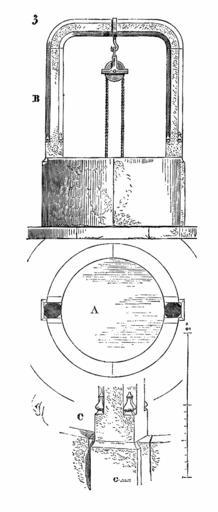 | Keywords: Puits.Carcassonne.2.png sur une petite place il existe un autre puits également creusé dans le roc mais d'un plus faible diamètre dont la margelle et la suspension de la poulie méritent d'être signalées Nous donnons fig 3 en A le plan et en B l'élévation de ce monument qui date comme le précédent du XIV<sup>e</sup> siècle Ici la traverse qui relie les deux piles est de grès et d'un seul morceau En C nous avons tracé le détail des bases des piles qui font corps avec le pilastre pénétrant dans la margelle afin d'éviter les dévers des deux monolithes La profondeur de ce puits est de 21<sup>m</sup> 40 et la nappe d'eau de 3<sup>m</sup> 50 Viollet-le-Duc Drawings by Eugène Viollet-le-Duc Well Historical wells in France Water wells in Aude |