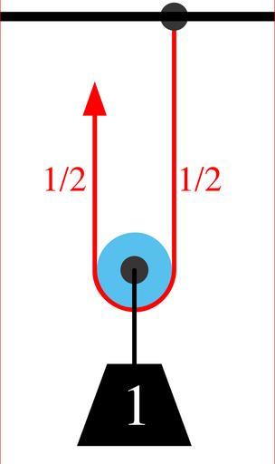 Keywords: Pulley1.png Pulley1 svg A single movable pulley lifting a unit weight The tension in the ropes is 1/2 for each rope Pulley force diagrams