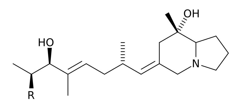 Keywords: Pumiliotoxin AB.svg Pumiliotoxin A R -H<br/> Pumiliotoxin B R -OH<br/> created with bkchem+inkscape 2006-04-01 own assumed Ayacop Pumiliotoxins