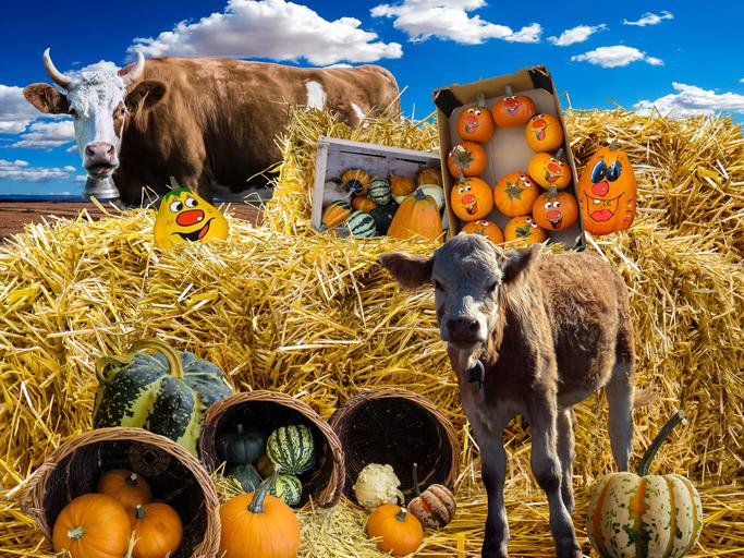 Keywords: pumpkin autumn decorative squashes harvest festival straw straw bales calf cow agriculture harvest basket face orange green deco decoration thanksgiving autumn decoration