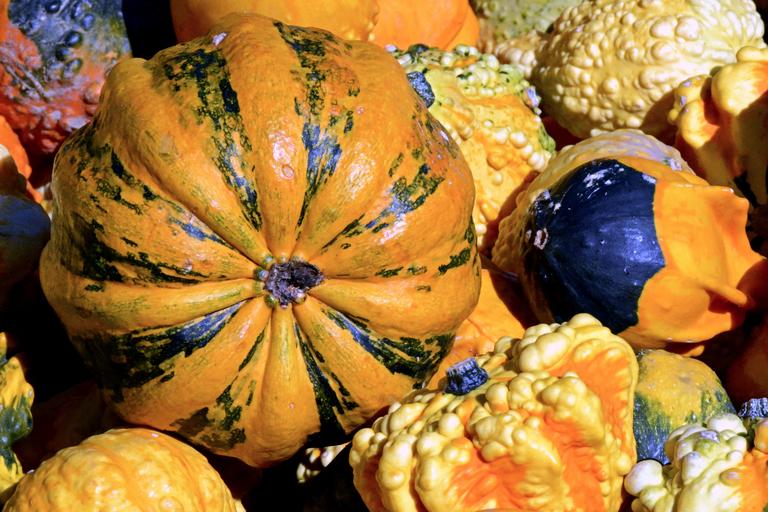 Keywords: pumpkin gourd autumn thanksgiving decoration harvest halloween decorative autumn decoration yellow white orange green stripes vegetables autumn motives nature structure stalk colorful cheerful