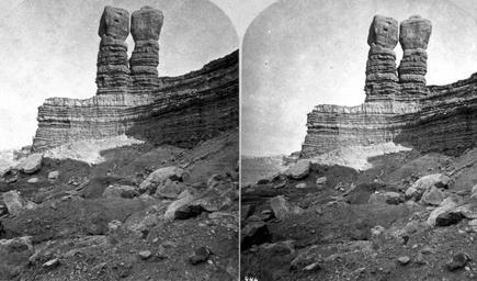 | Keywords: stereoscopic stereophotography stereophotographs historical usgs history geology mapping black and white blackandwhite bnw stereograph blackandwhite monochrome outdoor black and white Punch and Judy, now called Navajo Twins. Two solitary knobs left standing upon the edge of the tablelands bordering the San Juan River. This river affords an excellent study of the sandstones of this region. San Juan County, Utah. 1875. (Stereoscopic view similar to photo nos. 536, 1156) Punch and Judy, now called Navajo Twins. Two solitary knobs left standing upon the edge of the tablelands bordering the San Juan River. This river affords an excellent study of the sandstones of this region. San Juan County, Utah. 1875. (Stereoscopic view similar to photo nos. 536, 1156) |