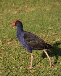 Keywords: purple swamphen porphyrio porphyrio bird wild black purple red beak native australia walking grass wildlife