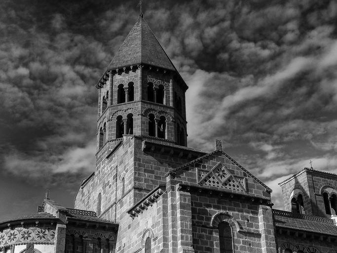 Keywords: puy-de-dome church building faith religion tower architecture town sky clouds black and white outside