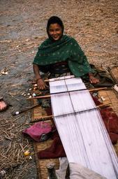 Keywords: handicrafts weaving nepal people Date: 1975-10 Location: Pokhara, Kaski Description: Woman weaving with back loom. A strap around her hips is used to keep tension on the weaving as she shuttles threads back and forth across to make the material. Her shawl was most likely created using this kind of loom. Date: 1975-10 Location: Pokhara, Kaski Description: Woman weaving with back loom. A strap around her hips is used to keep tension on the weaving as she shuttles threads back and forth across to make the material. Her shawl was most likely created using this kind of loom.
