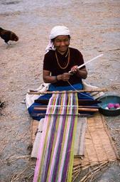 Keywords: handicrafts weaving nepal outdoor Date: 1975-10 Location: Pokhara, Kaski Description: Woman with back loom weaving colorful material. Date: 1975-10 Location: Pokhara, Kaski Description: Woman with back loom weaving colorful material.