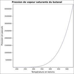 | Keywords: Pvs butanal.svg fr Pression de vapeur saturante calculée d'après <br/> Robert H Perry et Donald W Green Perry's Chemical Engineers' Handbook McGraw-Hill USA 1997 7e éd 2400 p ISBN 0-07-049841-5 p 2-50 own Epop 2010-06-24 Created with Gnumeric Vapor-Liquid equilibrium curves Butyraldehyde |