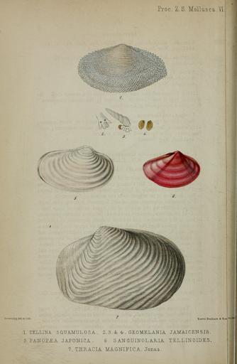 | Keywords: PZSL1849PlateMollusca06.png 1 Tellina squamulosa <small>A Adams</small> Tellinella asperrima <small> Hanley 1844 </small> Scutarcopagia pulcherrima for WoRMS <br/> 2-4 Geomelania Jamaicensis <small>Pfeiffer</small> Geomelania Geomelania jamaicensis <small>Pfeiffer 1845</small> 2 head 3 whole animal 4 operculum <br/> 5 Panopæa Japonica sic <small>A Adams</small> Panopea generosa <small>Gould 1850</small><br/> 6 Sanguinolaria tellinoides <small>A Adams</small> Sanguinolaria tellinoides <small>A Adams 1850</small><br/> 7 Thracia magnifica <small>A Adams</small> Cyathodonta rugosa <small> Lamarck 1818 </small><br/> en Bivalve shells 5 Geoduck 6 a sunset clam species and a looping snail species 2 Proceedings of the Zoological Society of London http //www archive org/details/proceedingsofgen48zool vol 1849 http //archive org/stream/proceedingsofgen48zool page/n233/mode/1up Mollusca VI 1849 published 1850 Sowerby PD-old-70-1923 PZSL 1849 Illustrations of Mollusca Tellinella Truncatellidae Panopea generosa Sanguinolaria tellinoides Cyathodonta rugosa |