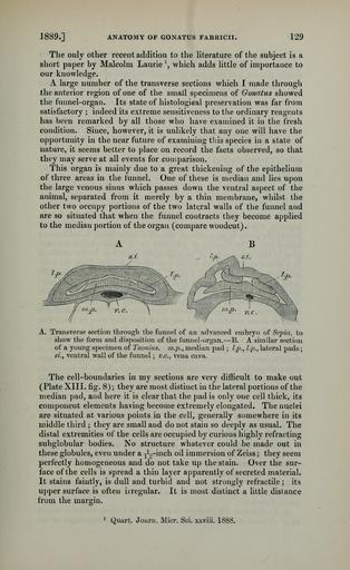 | Keywords: PZSL1889Page129.png A left Sepia sp Sepiidae sp embryo<br/> B right Taonius sp Taonius sp juv <br/> en Transverse section through the funnel region of an advanced cuttlefish embryo A and a glass squid larva B <br/> l p lateral pads m p median pad s i ventral wall of funnel v c vena cava Proceedings of the Zoological Society of London http //archive org/details/proceedingsofgen89zool vol 1889 issue 1 http //archive org/stream/proceedingsofgen89zool page/129/mode/1up page 129 1889 W E Hoyle text PD-old PZSL 1889-2 Cephalopoda anatomy Animal embryos Sepiidae Taonius Teuthida anatomy Larvae |
