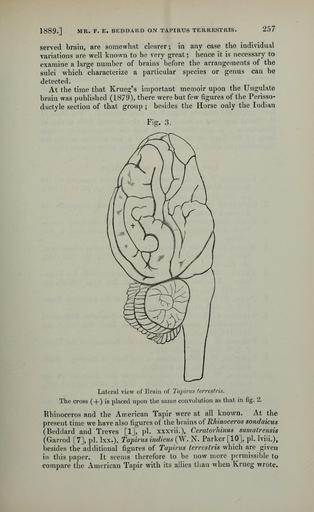 Keywords: PZSL1889Page257.png Tapirus terrestris <small></small> Tapirus terrestris <small> Linnaeus 1758 </small> juv page 256 Proceedings of the Zoological Society of London http //archive org/details/proceedingsofgen89zool vol 1889 issue 3 http //archive org/stream/proceedingsofgen89zool page/257/mode/1up page 257 1889 F E Beddard text PD-old PZSL 1889-3 Tapirus terrestris anatomy Mammal brain |