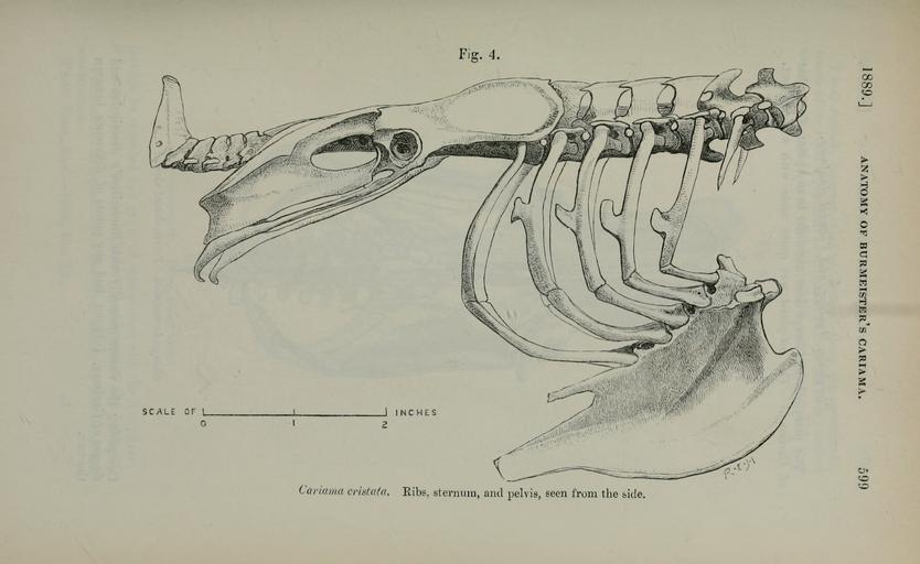 Keywords: PZSL1889Page599.png Cariama cristata Cariama cristata <small> Linnaeus 1766 </small> en Red-legged Seriema trunk and tail skeleton with sternum and pelvis from right lateral Proceedings of the Zoological Society of London http //archive org/details/proceedingsofgen89zool vol 1889 issue 4 http //archive org/stream/proceedingsofgen89zool page/599/mode/1up page 599 1889 published 1890 F E Beddard text PD-old-70-1923 PZSL 1889-4 Cariama cristata illustrations Cariamidae bones |
