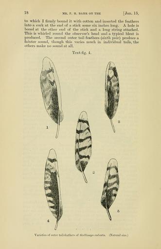 Keywords: PZSL1907Page018.png Gallinago cœlestis Gallinago gallinago <small> Linnaeus 1758 </small> en Common Snipe variation of the sound-producing outer rectrices Proceedings of the Zoological Society of London http //archive org/details/proceedingsofzoo19071446zool vol 1907 issue 1 http //archive org/stream/proceedingsofzoo19071446zool page/n65/mode/1up page 18 1907 P H Bahr text PD-old PZSL 1907-1 Gallinago gallinago illustrations Rectrices Scolopacidae feathers |