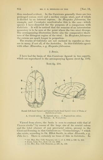 Keywords: PZSL1907Page0814.png Galidictis striata Galidictis fasciata striata <small>G Cuvier 1829</small> en Broad-striped Malagasy Mongoose brain from dorsal left and lateral right A crucial sulcus B lateral sulcus C suprasylvian sulcus D sylvian E postsylvian Proceedings of the Zoological Society of London http //archive org/details/proceedingsofzoo19074471121zool vol 1907 issue 4 http //archive org/stream/proceedingsofzoo19074471121zool page/814/mode/1up page 814 1907 published 1908 F E Beddard text PD-old PZSL 1907-4 Galidictis fasciata Mammal brain Eupleridae anatomy Lateral sulcus |