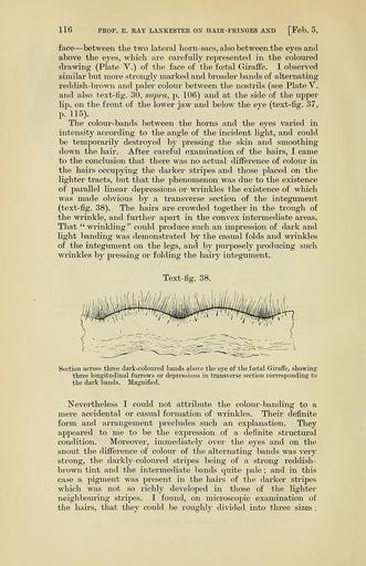 | Keywords: PZSL1907Page116.png Giraffa camelopardalis antiquorum ™‚ × G c wardi ™ Giraffa camelopardalis antiquorum <small>Swainson 1835</small> ™‚ × G c giraffa <small>von Schreber 1784</small> ™ foetus en Skin section through bands of dark hairs on top of head of hybrid giraffe foetus Kordofan Giraffe male × South African Giraffe female Recovered at about 350 days of gestation two-third term from mother which died in London Zoo on May 5 1906 Bands correspond to the furrows visible in the section Proceedings of the Zoological Society of London http //archive org/details/proceedingsofzoo19071446zool vol 1907 issue 1 http //archive org/stream/proceedingsofzoo19071446zool page/116/mode/1up page 116 1907 E Ray Lankester text PD-old <gallery> File PZSL1907Plate05 png Same specimen head from above File PZSL1907Page106 png Same specimen partially dissected head from right lateral File PZSL1907Page107 png Same specimen left horn File PZSL1907Page108 png Same specimen pattern of hairs between horn bases File PZSL1907Page112 png Same specimen skull from right lateral File PZSL1907Page115 png Same specimen head from left lateral File PZSL1907Page117 png Same specimen section of skin of forehead File PZSL1907Page118 png Same specimen pattern of hairs on forehead </gallery> 1906 Giraffa camelopardalis hybrid foetus from London Zoo Animal hair PZSL 1907-1 |