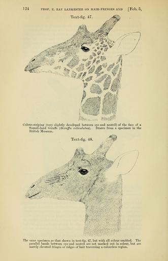 Keywords: PZSL1907Page124.png Giraffa reticulatus Giraffa camelopardalis giraffa <small>von Schreber 1784</small> en Head of Somali Giraffe specimen in Natural History Museum from left lateral showing coloration above and with coloration ignored to show direction of hair growth below Proceedings of the Zoological Society of London http //archive org/details/proceedingsofzoo19071446zool vol 1907 issue 1 http //archive org/stream/proceedingsofzoo19071446zool page/124/mode/1up page 124 1907 E Ray Lankester text PD-old PZSL 1907-1 Collections of the Natural History Museum London Giraffa camelopardalis reticulata head |