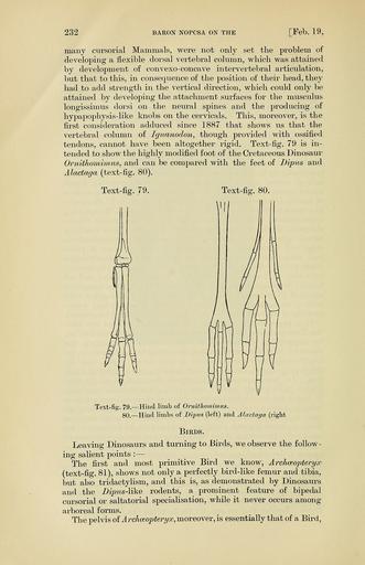 | Keywords: PZSL1907Page232.png 79 left Ornithomimus sp Ornithomimidae sp <br/> 80 center Dipus sp Dipus sagitta <small> Pallas 1773 </small><br/> 80 right Alactaga sp Allactaga sp en Feet of a Cretaceous ostrich dinosaur left a Northern Three-toed Jerboa center and an undetermined species of Asian five-tailed jerboa right all in frontal view Proceedings of the Zoological Society of London http //archive org/details/proceedingsofzoo19071446zool vol 1907 issue 1 http //archive org/stream/proceedingsofzoo19071446zool page/232/mode/1up page 232 1907 Baron Nopcsa text PD-old PZSL 1907-1 Animal limb bone comparisons Animal feet Ornithomimus fossils Cretaceous fossils Reptilia limb bones Reptilia feet Dipus sagitta Allactaga Mammal limb bones Dipodidae bones Rodentia feet Ferenc Nopcsa |