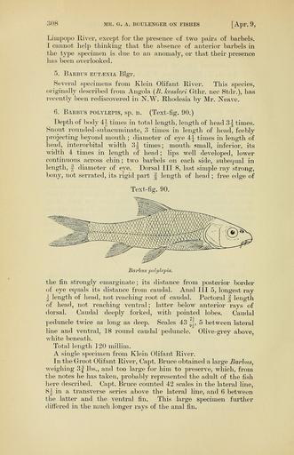 | Keywords: PZSL1907Page308.png Barbus polylepis <small>Boulenger</small> Labeobarbus polylepis <small> Boulenger 1907 </small> en Smallscale Yellowfish Proceedings of the Zoological Society of London http //archive org/details/proceedingsofzoo19071446zool vol 1907 issue 2 http //archive org/stream/proceedingsofzoo19071446zool page/308/mode/1up page 308 1907 G A Boulenger text PD-old PZSL 1907-2 Labeobarbus | ||||