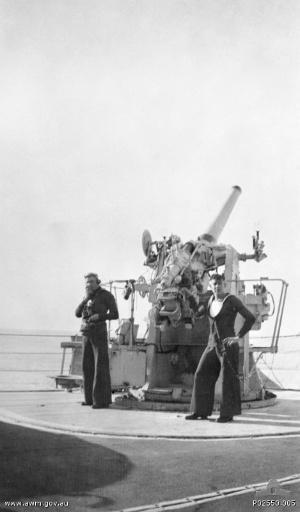 | Keywords: QF 4 inch Mk V HA gun HMAS Canberra 1940 AWM P02550.005.jpeg AWM caption Two RAN sailors S3207 Able Seaman AB Percy A Tipper left and 23424 AB Cecil A Dobell right pose in front of their gun mount a 4 inch anti-aircraft gun forming part of the secondary armament of the Kent class cruiser HMAS Canberra HMAS Canberra was sunk on 9 August 1942 off Savo Island in the battle of Guadalcanal AB Dobell had drafted off the ship beforehand whereas AB Tipper survived the sinking uninjured P02550 005 Credit line Donor L Rudd ~ 1940 photographer not identified Copyright expired - public domain PD-AustraliaGov World War II forces of Australia QF 4 inch Mk V naval gun Canberra HMAS Canberra D33 Black and white photographs |