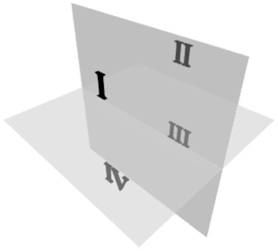 | Keywords: Quadrants in descriptive geometry.png Created with Persistence of Vision Modern orthographic projection is derived from Gaspard Monge's descriptive geometry Monge defined a reference system of two viewing planes horizontal H ground and vertical V backdrop These two planes partition 3D space into 4 quadrants which he labeled I II III and IV own 2008-01-02 SharkD Check categories 2008 November 23 en wikipedia Multiview_orthographic_projection Chart POV-Ray source code <source lang povray > include math inc include finish inc include transforms inc global_settings assumed_gamma 1 0 radiosity brightness 0 3 camera location -z 3 look_at 0 up y right x rotate <asind tand 30 45 0 > light_source <0 0 -100 > color rgb <1 1 1 > rotate <60 30 00 > parallel shadowless polygon 4 <+0 -1 -1 > <+0 +1 -1 > <+0 +1 +1 > <+0 -1 +1 > texture pigment rgbt <1 1 1 0 75 > polygon 4 <-1 +0 -1 > <-1 +0 +1 > <+1 +0 +1 > <+1 +0 -1 > texture pigment rgbt <1 1 1 0 75 > text ttf TIMES TTF II 0 1 0 pigment color rgb 0 rotate y 90 scale 1/3 translate <+0 5 +0 5 +0 0 > text ttf TIMES TTF I 0 1 0 pigment color rgb 0 rotate y 90 scale 1/3 translate <-0 5 +0 5 0 0 > text ttf TIMES TTF IV 0 1 0 pigment color rgb 0 rotate y 90 scale 1/3 translate <-0 5 -0 5 +0 0 > text ttf TIMES TTF III 0 1 0 pigment color rgb 0 rotate y 90 scale 1/3 translate <+0 5 -0 5 +0 0 > </source> Descriptive geometry Images with Povray source code |