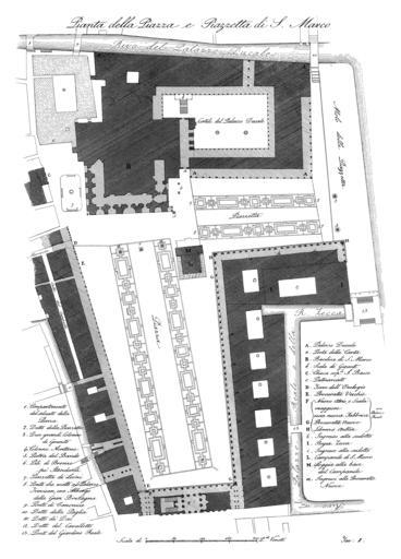 | Keywords: Quadri-Moretti, Piazza San Marco (1831), 01.jpg 16 I 02 Pianta della Piazza e Piazetta di San Marco LangSwitch Map of the Piazza and the Piazetta San Marco in Venice Italy from 1831 In general the buildings around the Piazza haven ™t changed since then so this plan reflects the modern situation nearly exactly Plan der Piazza und der Piazetta San Marco in Venedig aus dem Jahr 1831 Im Allgemeinen haben sich die Gebäude um die Piazza seitdem kaum verändert so dass dieser Plan auch die heutige Situation recht exakt wiedergibt PD-old-100-1923 Old maps of Venice 1831 Plans of squares in Italy 1831 1831 Venice ImageNote 1 2300 702 1804 1671 5217 7252 2 Palazzo Ducale Duke ™s Palace ImageNoteEnd 1 ImageNote 2 956 1065 1404 1768 5217 7252 2 Basilica di San Marco St Mark ™s Basilica ImageNoteEnd 2 ImageNote 3 2251 3136 448 521 5217 7252 2 Campanile di San Marco St Mark ™s Campanile ImageNoteEnd 3 ImageNote 4 4285 2482 169 157 5217 7252 2 Column with St Mark ™s lion ImageNoteEnd 4 ImageNote 5 4321 2906 157 157 5217 7252 2 Column of San Teodoro Saint Theodore of Amasea ImageNoteEnd 5 ImageNote 6 569 1852 581 981 5217 7252 2 Piazzetta dei leoncini ImageNoteEnd 6 ImageNote 7 387 3233 1513 3438 5217 7252 2 Procuratie Vecchie ImageNoteEnd 7 ImageNote 8 2820 3947 1005 2664 5217 7252 2 Procuratie Nuove ImageNoteEnd 8 ImageNote 9 1791 6259 1404 460 5217 7252 2 Ala Napoleonica ImageNoteEnd 9 ImageNote 10 2736 3087 1816 533 5217 7252 2 Bibliotheca Marciana ImageNoteEnd 10 ImageNote 11 3365 3354 1247 654 5217 7252 2 Zecca old coin mint ImageNoteEnd 11 ImageNote 12 375 714 920 1186 5217 7252 2 Patriarcato di San Marco Palace of the Patriarch of Venice ImageNoteEnd 12 |