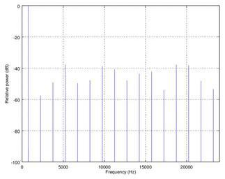 | Keywords: Quantization nodither noshaping spectrum.png en Spectrum of a 750 Hz pure tone sampled at 48 kHz and quantized to 4 bits using neither dither nor noise shaping <pre> quantization_nodither_noshaping m Quantization demo using neither dither nor noise shaping Authors Fatbag License Public domain no warranties rand 'state' 0xdeadbeef ; f_s 48000; sampling rate samples/sec f0 750; frequency of sine wave Hz t_s 1/f_s; sampling period sec/sample w0 2 pi f0; angular frequency of sine wave Hz t 0 4095 t_s; x round 15 sin w0 t ; figure 1; plot t 1 ceil 2 f_s/f0 x 1 ceil 2 f_s/f0 ; axis 0 ceil 2 f_s/f0 t_s -20 20 ; grid on; xlabel 't' ; ylabel 'x t ' ; figure 2; X fft x 1 4096 ; X X 1 2048 ; m 20 log10 arrayfun norm X ; m - max m ; m ~isfinite m -1000; f 0 2047 /2048 f_s/2; plot f m ; axis 0 f_s/2 -100 0 ; grid on; xlabel 'Frequency Hz ' ; ylabel 'Relative power dB ' ; print 'quantization_nodither_noshaping_spectrum_uncropped png';</pre> 2015-11-13 own Andrew D'Addesio other versions cc-zero Digital audio Quantization Uploaded with UploadWizard |