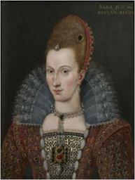 Keywords: stuart english royalty englishroyalty portrait 16th century 16thcentury 17th century 17thcentury scotland united kingdom unitedkingdom britain people indoor Anne of Denmark (12 December 1574 – 2 March 1619) was queen consort of Scotland, England, and Ireland as the wife of King James VI and I.[1] The second daughter of King Frederick II of Denmark, Anne married James in 1589 at the age of fourteen and bore him three children who survived infancy, including the future Charles I. She demonstrated an independent streak and a willingness to use factional Scottish politics in her conflicts with James over the custody of Prince Henry and his treatment of her friend Beatrix Ruthven. Anne appears to have loved James at first, but the couple gradually drifted and eventually lived apart, though mutual respect and a degree of affection survived.[2] In England, Anne shifted her energies from factional politics to patronage of the arts and constructed a magnificent court of her own, hosting one of the richest cultural salons in Europe.[3] After 1612, she suffered sustained bouts of ill health and gradually withdrew from the centre of court life. Though she was reported to have died a Protestant, evidence suggests that she may have converted to Catholicism at some stage in her life.[4] Historians have traditionally dismissed Anne as a lightweight queen, frivolous and self-indulgent.[5] However, recent reappraisals acknowledge Anne's assertive independence and, in particular, her dynamic significance as a patron of the arts during the Jacobean age. Anne of Denmark (12 December 1574 – 2 March 1619) was queen consort of Scotland, England, and Ireland as the wife of King James VI and I.[1] The second daughter of King Frederick II of Denmark, Anne married James in 1589 at the age of fourteen and bore him three children who survived infancy, including the future Charles I. She demonstrated an independent streak and a willingness to use factional Scottish politics in her conflicts with James over the custody of Prince Henry and his treatment of her friend Beatrix Ruthven. Anne appears to have loved James at first, but the couple gradually drifted and eventually lived apart, though mutual respect and a degree of affection survived.[2] In England, Anne shifted her energies from factional politics to patronage of the arts and constructed a magnificent court of her own, hosting one of the richest cultural salons in Europe.[3] After 1612, she suffered sustained bouts of ill health and gradually withdrew from the centre of court life. Though she was reported to have died a Protestant, evidence suggests that she may have converted to Catholicism at some stage in her life.[4] Historians have traditionally dismissed Anne as a lightweight queen, frivolous and self-indulgent.[5] However, recent reappraisals acknowledge Anne's assertive independence and, in particular, her dynamic significance as a patron of the arts during the Jacobean age.