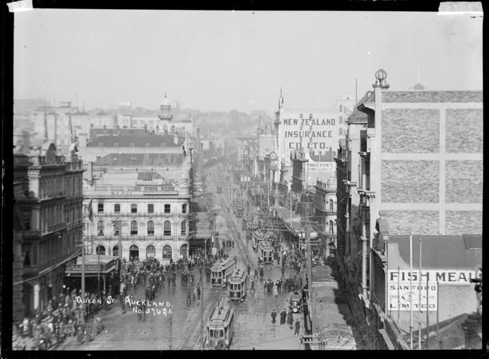 Keywords: blackandwhite monochrome photo border outdoor architecture skyline black and white View looking up Queen Street taken from a high vantage point to the right of the General Post Office and the Waverley Hotel in lower Queen Street. The Thames Hotel can be seen in the foreground on the left and Sandford Ltd on the right. Identifiable buildings further up Queen Street are the Waitemata Hotel, Smeeton's Building, New Zealand Insurance Co Ltd, and JCL (John Court Ltd). Partington's Windmill can be seen on the horizon. A large number of people and trams are in the immediate foreground near to the Thames Hotel and Post Office. Taken by William A Price in the early 1900s. Inscriptions: Inscribed - Photographer's title on negative -bottom left: Queen St. Auckland. No 3765A. Quantity: 1 b&w original negative(s). Physical Description: Dry plate glass negative 4.5 x 6.5 inches Queen Street, Auckland. Price, William Archer, 1866-1948 :Collection of post card negatives. Ref: 1/2-001008-G. Alexander Turnbull Library, Wellington, New Zealand. natlib.govt.nz/records/22806344 View looking up Queen Street taken from a high vantage point to the right of the General Post Office and the Waverley Hotel in lower Queen Street. The Thames Hotel can be seen in the foreground on the left and Sandford Ltd on the right. Identifiable buildings further up Queen Street are the Waitemata Hotel, Smeeton's Building, New Zealand Insurance Co Ltd, and JCL (John Court Ltd). Partington's Windmill can be seen on the horizon. A large number of people and trams are in the immediate foreground near to the Thames Hotel and Post Office. Taken by William A Price in the early 1900s. Inscriptions: Inscribed - Photographer's title on negative -bottom left: Queen St. Auckland. No 3765A. Quantity: 1 b&w original negative(s). Physical Description: Dry plate glass negative 4.5 x 6.5 inches Queen Street, Auckland. Price, William Archer, 1866-1948 :Collection of post card negatives. Ref: 1/2-001008-G. Alexander Turnbull Library, Wellington, New Zealand. natlib.govt.nz/records/22806344 |
