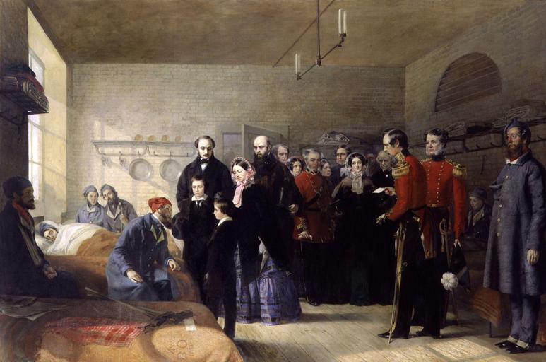 Keywords: Queen Victoria's First Visit to her Wounded Soldiers by Jerry Barrett.jpg Queen Victoria's First Visit to her Wounded Soldiers by Jerry Barrett died 1906 See source website for additional information Queen Victoria's First Visit to Her Wounded Soldiers Victoria is accompanied by her husband Prince Albert and her sons the Prince of Wales and Prince Alfred Accompanying the royal family are George Barratt Charlotte Canning Countess Canning George Russell Dartnell Col and Mrs Eden Prince George Duke of Cambridge Sir Charles Grey Henry Hardinge 1st Viscount Hardinge Hon Lucy May Kerr and Sir Charles Beaumont Phipps The man seated on the bed is identified as Sergeant Leny while the wounded soldier in the bed is identified as James Higgins The men are attended by army surgeon Henry Cooper Reade This set of images was gathered by User Dcoetzee from the National Portrait Gallery London website using a special tool All images in this batch have been confirmed as author died before 1939 according to the official death date listed by the NPG 6203 http //www npg org uk/collections/search/portrait php LinkID mp01915 rNo 0 role sit 1859 Jerry Barrett died 1906 PD-old-100 National Portrait Gallery London Paintings of Victoria of the United Kingdom Jerry Barrett Charlotte Canning Wounded people in art Children in art 19th-century medicine in painting 19th-century military life in painting Soldiers life during the Crimean War |