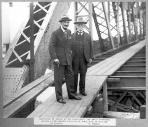 | Keywords: Queensland State Archives 2793 Inspection of the Story Bridge construction by His Excellency the State Governor Sir Leslie Orme Wilson and Dr John Bradfield 7 July 1938.png en Inspection of the Story Bridge construction by His Excellency the State Governor Sir Leslie Orme Wilson and Dr John Bradfield The Governor is on the left and Dr Bradfield the Consulting Engineer on the Story Bridge project is on the right 1938-07-07 http //www archivessearch qld gov au/Image/DigitalImageDetails aspx ImageId 2793 Preferred citation Queensland State Archives Digital Image ID 2793 ID label 1137563 http //www archivessearch qld gov au/Search/AgencyDetails aspx AgencyID 1995 Lands Department Survey Office Cartographic Branch Photographic Section en Copyright expired Information field Decade 1930-1939 Information field Place en Brisbane City Information field Keywords en Bridges Information field Material Type en Photographic material Information field Type en Image PD-Australia QSA media uploaded by User 99of9 Photographic material from the Queensland State Archives 1938 in Queensland Leslie Orme Wilson John Bradfield Story Bridge construction Inspections |