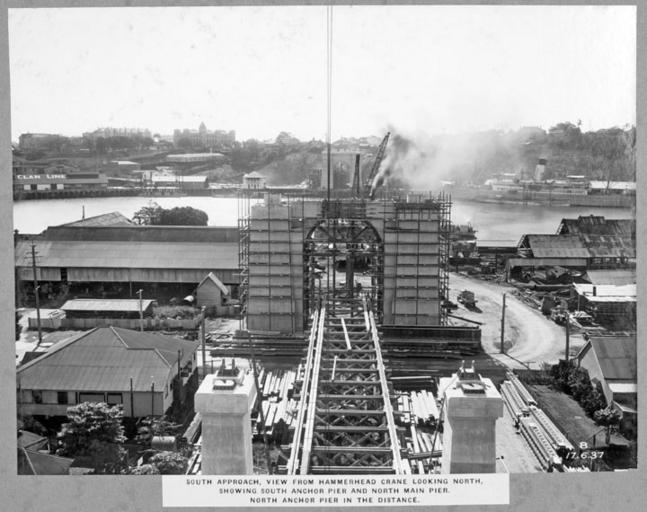 | Keywords: Queensland State Archives 3479 South approach view from hammerhead crane looking north showing south anchor pier and north main pier with north anchor pier in the distance 17 June 1937.png en South approach view from hammerhead crane looking north showing south anchor pier and north main pier with north anchor pier in the distance Story Bridge construction 1937-06-17 http //www archivessearch qld gov au/Image/DigitalImageDetails aspx ImageId 3479 Preferred citation Queensland State Archives Digital Image ID 3479 ID label 1235477 http //www archivessearch qld gov au/Search/AgencyDetails aspx AgencyID 1995 Lands Department Survey Office Cartographic Branch Photographic Section en Copyright expired Information field Decade 1930-1939 Information field Place en Brisbane City Information field Material Type en Photographic material Information field Type en Image PD-Australia QSA media uploaded by User 99of9 Photographic material from the Queensland State Archives 1937 in Brisbane Story Bridge construction Construction cranes in Australia Bridge supports in Queensland Girders |