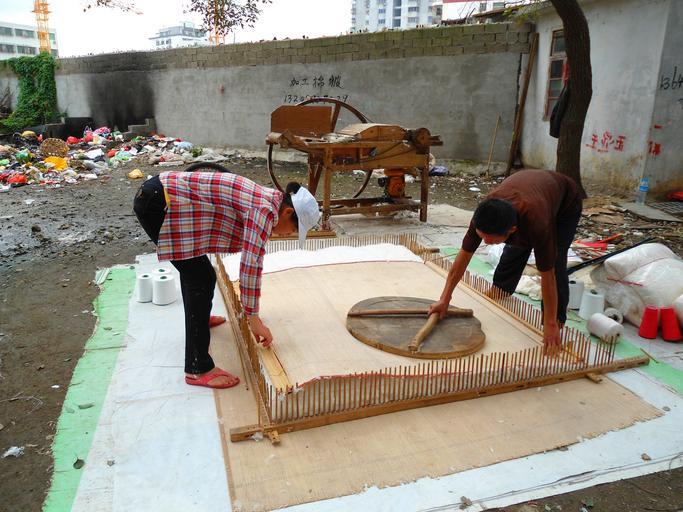 | Keywords: Quilt making 17.JPG en Blanket making in Haikou Hainan People's Republic of China A quilt maker presses a heavy wooden disk down onto the cotton batting in order to compact it 2012-01-19 own Anna Frodesiak cc-zero Uploaded with UploadWizard Quilting in Haikou Files by User Anna Frodesiak Outdoor workers in China People at work in China |