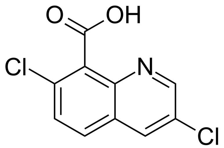 Keywords: Quinclorac.svg Chemical structure of Quinclorac Own 14 35 23 July 2012 UTC Ed Edgar181 Herbicides Chloroaromatics Quinaldic acids Haloquinolines Carboxylic acids
