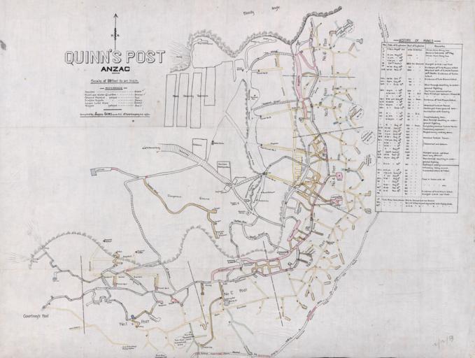 | Keywords: Quinn’s Post - ANZAC trench & tunnel map.png Quinn ™s Post - ANZAC trench tunnel map jpg Quinn ™s Post was the most advanced ANZAC post located on the northern edge of the main ANZAC line Along with Pope ™s Hill it was one of the keys to the Monash and Shrapnel valleys If it had fallen the Turks could have broken into the heart of the ANZAC position This plan of Quinn ™s Post was made by Sapper later Lieutenant Ronald McInnis It shows Quinn ™s Post as it was in November and December 1915 As well as showing all the trenches saps and tunnels at Quinn ™s it also shows interesting features such as the sleeping terraces established by Lieutenant Colonel William Malone of the Wellington Battalion and the locations of explosions of Turkish mines The plan also includes a table detailing the exploding of mines at Quinn ™s Post and the results of the explosions Australian War Memorial<br>reference code G7432 G1 S65 XII 8e<br>url http //www awm gov au/exhibitions/gmaps/trench/quinn asp 1915-12 Ronald McInnis PD-Australia Maps of the Battle of Gallipoli |