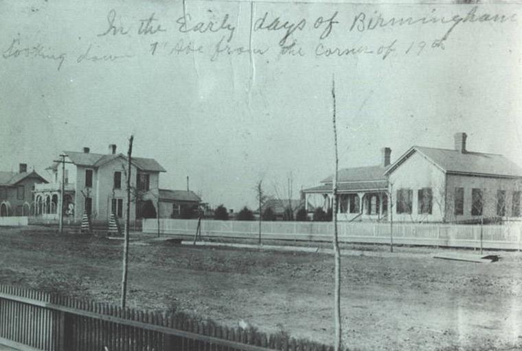 Keywords: outdoor An early photograph of Birmingham, Alabama, looking down 7th Avenue from 19th Street. Birmingham was founded in 1871, during the post-Civil War Reconstruction period, through the merger of three pre-existing farm towns, notably, former Elyton. It grew into an industrial and railroad transportation center with a focus on mining, the iron and steel industry, and railroading. Birmingham was named for Birmingham, England, UK, one of that nation's major iron and steel producing cities. Many, if not most, of the original settlers who founded Birmingham were of English ancestry. In one writer's view, the city was planned as a place where cheap, non-unionized, and African-American labor from rural Alabama could be employed in the city's steel mills and blast furnaces, giving it a competitive advantage over industrial cities in the Midwest and Northeast. An early photograph of Birmingham, Alabama, looking down 7th Avenue from 19th Street. Birmingham was founded in 1871, during the post-Civil War Reconstruction period, through the merger of three pre-existing farm towns, notably, former Elyton. It grew into an industrial and railroad transportation center with a focus on mining, the iron and steel industry, and railroading. Birmingham was named for Birmingham, England, UK, one of that nation's major iron and steel producing cities. Many, if not most, of the original settlers who founded Birmingham were of English ancestry. In one writer's view, the city was planned as a place where cheap, non-unionized, and African-American labor from rural Alabama could be employed in the city's steel mills and blast furnaces, giving it a competitive advantage over industrial cities in the Midwest and Northeast.