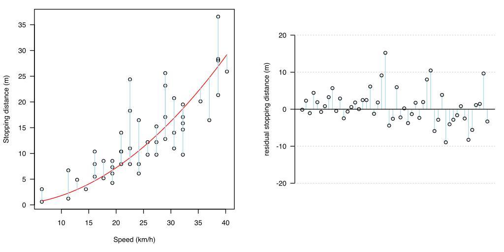 | Keywords: R-car stopping distances 1920+quadratic.svg en A simple graph of car stopping distances with a simple quadratic zero intercept fit and residual plot Own HYanWong 2008-12-13 Created with R using the following commands <pre>svg R-car_stopping_distances_1920+quadratic svg 8 4 8 layout t 1 2 par mar c 5 4 1 2 + 0 1 cars speed kph <- cars speed 1 609344 cars dist m <- cars dist 0 3048 plot dist m ~ speed kph data cars xlab Speed km/h ylab Stopping distance m las 1 quad model <- lm dist m~I speed kph 2 -1 data cars curve quad model coef1 x 2 col red add TRUE segments cars speed kph fitted values quad model cars speed kph fitted values quad model +residuals quad model col lightblue par mar c 5 5 1 1 + 0 1 plot residuals quad model type h ylim c -25 25 bty n xaxt n las 2 xlab NA ylab residual stopping distance m col lightblue grid NA NULL abline h 0 points residuals quad model dev off </pre> Uncategorized 2015 March 23 |