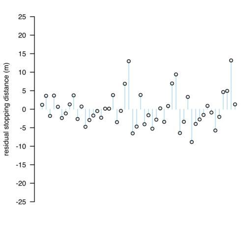 | Keywords: R-car stopping distances 1920+linear-resids.svg  en Residuals from a simple linear model of car stopping distances Own HYanWong 2009-01-19 Created with R using the following commands <pre>svg R-car_stopping_distances_1920+linear-resids svg 4 4 8 par mar c 5 4 1 1 + 0 1 cars speed kph <- cars speed 1 609344 cars dist m <- cars dist 0 3048 straight line model <- lm dist m~speed kph data cars This creates and stores a model lm means Linear Model plot residuals straight line model type h ylim c -25 25 yaxp c -25 25 10 bty n xaxt n las 2 xlab NA ylab residual stopping distance m col lightblue points residuals straight line model dev off </pre> Uncategorized 2015 March 23 |
