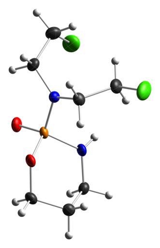 Keywords: R-cyclophosphamide-from-xtal-1996-CM-3D-ellipsoids.png Thermal ellipsoid diagram of the R enantiomer of cyclophosphamide as found in the crystal structure of racemic cyclophosphamide C<sub>7</sub>H<sub>15</sub>Cl<sub>2</sub>N<sub>2</sub>O<sub>2</sub>P Colour code Carbon C black Hydrogen H white Nitrogen N blue Oxygen O red Phosphorus P orange Chlorine Cl green Crystal structure from http //dx doi org/10 1107/S0108270196004866 Acta Cryst 1996 C52 2359 “2363 Image generated in http //www crystalmaker com/ CrystalMaker 8 3 Own 2010-09-29 Ben Mills Benjah-bmm27 Images by Ben Mills Cyclophosphamide |