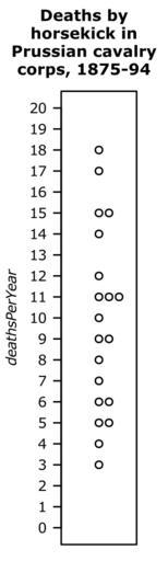 | Keywords: R-horsekick totals-1D stack.svg  en 1D vertical scatterplot aka vertical dotplot or stripplot example with discrete data points stacked Data von Bortkiewicz's famous dataset of deaths by horse kick in Prussian cavalry corps own HYanWong 2009-03-06 Created with R using the following commands <pre> svg file R-horsekick_totals-1D_stack svg width 1 5 height 5 pointsize 8 1D vertical scatterplot aka vertical dotplot or stripplot example with discrete data points stacked Data von Bortkiewicz's famous dataset of deaths by horse kick in Prussian cavalry corps library pscl par mar c 1 4 6 2 +0 1 stripchart tapply prussian y prussian year sum pch 1 ylab expression italic deathsPerYear method stack vertical TRUE las 1 yaxp c 0 20 20 ylim c 0 20 offset 0 9 title Deaths by\nhorsekick in\nPrussian cavalry\ncorps 1875-94 outer TRUE line -5 dev off </pre> Dot plots |