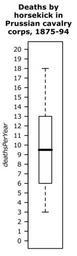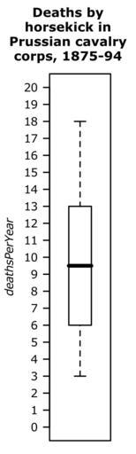 | Keywords: R-horsekick totals-boxplot.svg  en Simple boxplot example with discrete data Data von Bortkiewicz's famous dataset of deaths by horse kick in Prussian cavalry corps own HYanWong 2009-03-06 Created with R using the following commands <pre> svg file R-horsekick_totals-boxplot svg width 1 5 height 5 pointsize 8 Simple boxplot example with discrete data Data von Bortkiewicz's famous dataset of deaths by horse kick in Prussian cavalry corps library pscl par mar c 1 4 6 2 +0 1 boxplot tapply prussian y prussian year sum las 1 ylab expression italic deathsPerYear yaxp c 0 20 20 ylim c 0 20 title Deaths by\nhorsekick in\nPrussian cavalry\ncorps 1875-94 outer TRUE line -5 dev off </pre> Box plots |