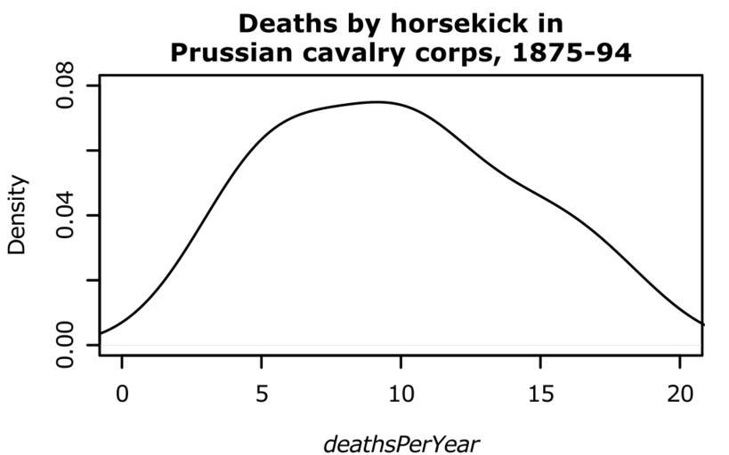 | Keywords: R-horsekick totals-density.svg  en Example R plot kernel density plot of von Bortkiewicz's famous dataset of deaths by horse kick in Prussian cavalry corps own HYanWong 2009-03-06 v svg file R-horsekick_totals-density svg width 4 height 2 5 pointsize 8 Example R plot kernel density plot of von Bortkiewicz's famous dataset of deaths by horse kick in Prussian cavalry corps library pscl par mar c 4 4 3 1 +0 1 X <- tapply prussian y prussian year sum plot density X ylim c 0 0 08 xlim c 0 20 xlab expression italic deathsPerYear main Deaths by horsekick in\nPrussian cavalry corps 1875-94 dev off Uncategorized 2015 March 23 |