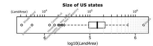 | Keywords: R-US state areas-boxplot log+extras.svg en Horizontal boxplot example with logged base 10 continuous data outliers identified by name and both log linear axes plotted Data US state areas Own HYanWong 2009-03-06 Created with R using the following commands <pre> svg file R-US_state_areas-boxplot_log+extras svg width 5 height 1 5 pointsize 8 Horizontal boxplot example with logged base 10 continuous data outliers identified by name and both log linear axes plotted Data US state areas par mar c 3 4 4 1 +0 1 X <- log10 state area 2 58998811 bp <- boxplot X horizontal TRUE xaxt n xlab axis 1 4 6 mgp c 1 5 0 5 0 axis 3 log10 1 9 rep 10 3 7 each 9 rep 45 axis 3 log10 10 3 6 expression 10 3 10 4 10 5 10 6 cex axis 0 8 mgp c 2 5 1 0 mtext expression italic LandArea 3 line 0 8 adj -0 05 cex 0 8 abline v log10 seq 0 2e6 100000 lty dotted col lightgray title main Size of US states line 2 5 title xlab expression log10 italic LandArea mgp c 2 0 5 0 Label outliers outliers <- order match X sort boxplot stats X out na last NA odd <- c TRUE FALSE text Xoutliersodd 1 labels state nameoutliersodd adj -0 2 cex 0 65 srt 45 xpd NA col grey40 text Xoutliers odd 1 labels state nameoutliers odd adj 1 2 cex 0 65 srt 45 xpd NA col grey40 dev off </pre> Box plots Images with R source code |