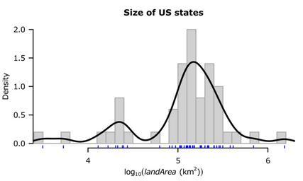 Keywords: R-US state areas-hist+dens log.svg en Histogram with overlayed Gaussian kernel density plot example for log-transformed data base 10 with points marked Data US state areas Own HYanWong 2009-03-06 Created with R using the following commands <pre> svg file R-US_state_areas-hist+dens_log svg width 5 height 3 pointsize 8 Histogram with overlayed Gaussian kernel density plot example for log-transformed data base 10 with points marked Data US state areas par mar c 4 4 3 1 +0 1 X <- log10 state area 2 58998811 hist X 25 freq FALSE col lightgrey border darkgrey main Size of US states xlab las 1 mgp c 3 1 0 xlim range X xaxt n axis 1 4 6 title xlab expression log10 paste italic landArea km 2 mgp c 2 5 1 0 lines density X lwd 2 segments X rep par usr 3 length X X rep par usr 3/2 length X col blue dev off </pre> Histograms |