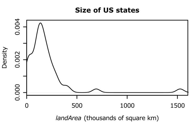 Keywords: R-US state areas-density.svg en Kernel density plot example Data US state areas Own HYanWong 2009-03-06 v svg file R-US_state_areas-density svg width 4 height 2 5 pointsize 8 Kernel density plot example Data US state areas par mar c 4 4 3 1 +0 1 X <- state area 2 58998811/1000 plot density X main Size of US states xlab expression paste italic landArea thousands of square km xlim c 0 max X 1 05 xaxs i dev off Uncategorized 2015 March 23 |